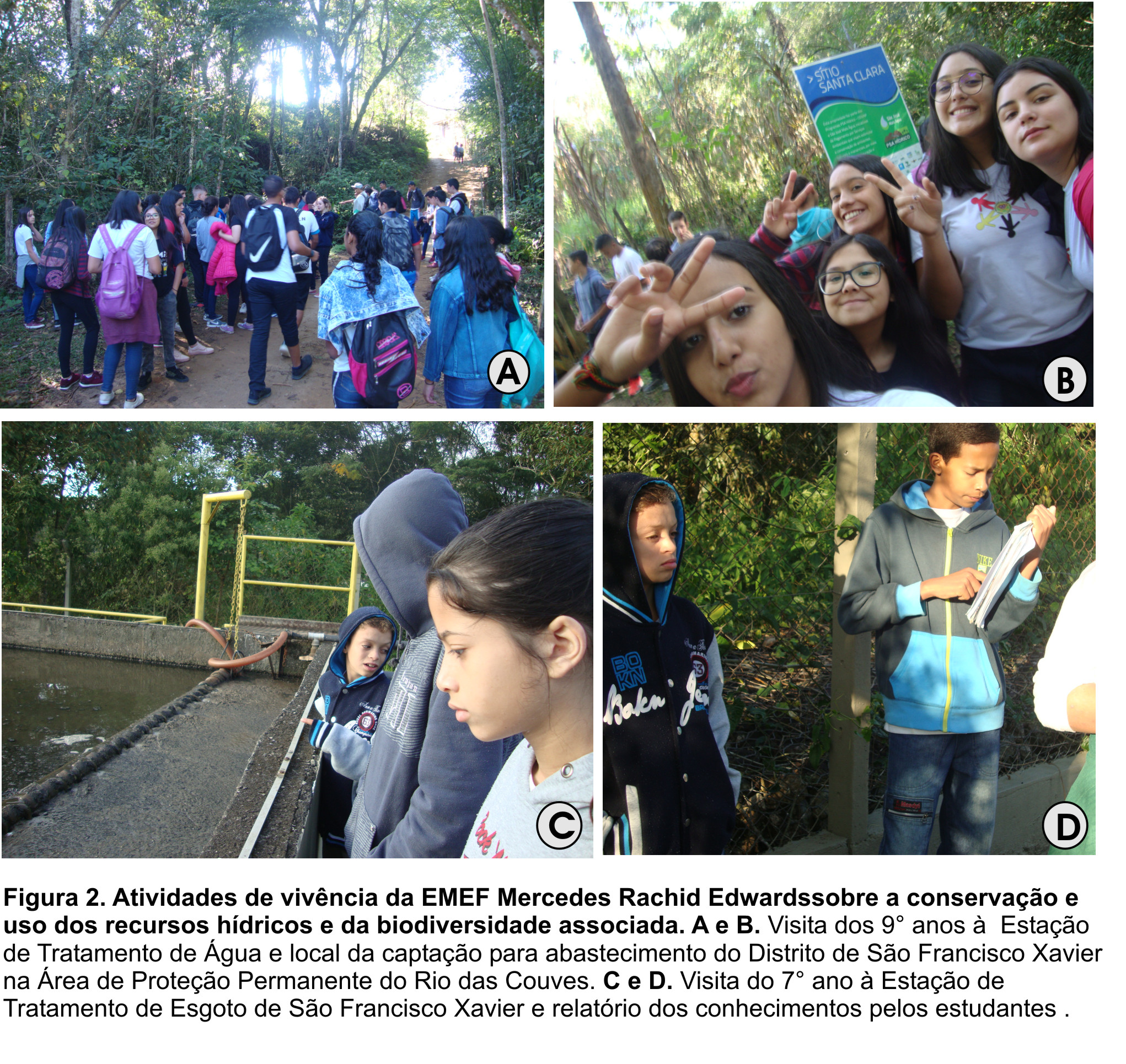 Resultados:  Os principais resultados compreendidos se referem à(ao): – Aprendizagem e satisfação dos estudantes pela integração da vivência prática aos conhecimentos teóricos na área socioambiental no que tange a conservação dos recursos hídricos e da biodiversidade; – Aprofundamento de conteúdos amplos da matriz pelo contato e entendimento direto da realidade local pelos estudantes que envolvem diretamente aspectos preventivos e mitigadores de riscos socioambientais; – Aquisição de novas habilidades pelos estudantes e docentes ligadas à educomunicação (e.g. oratória, produção de textos, formas de divulgação, registros em fotos e vídeos, escolha e edição de materiais para educação ambiental) resultando em um documentário para a 6ª Mostra de Vídeos Ambientais do Programa Revitalização de Nascentes; – Contato dos alunos com moradores e agentes de diferentes setores da sociedade envolvidos na gestão dos recursos hídricos locais; – Continuidade das ações ambientais e fortalecimento dos temas em várias frentes educativas na escola, com ganho de apoio e abertura em níveis maiores da gestão; – Fortalecimento de parcerias construídas pelos professores ao longo dos anos com a comunidade do entorno e representantes de organizações-chave para a conservação dos recursos hídricos e da biodiversidade local, como OSCs e gestores; – Aumento da Qualidade Ambiental da Unidade Escolar, sobretudo pelos plantios de árvores frutíferas nativas da Mata Atlântica (ligando a temática da segurança alimentar à conservação da biodiversidade e da cultura local) e pelas campanhas educativas de limpeza; – Fortalecimento das ações do Programa Municipal Revitalização de Nascentes pela adesão local e comunitária a partir do empenho das ações pela escola e sua inserção no plano político pedagógico, enquanto uma das escolas sustentáveis da rede de ensino; – Aprofundamento dos conhecimentos pelos estudantes sobre causas e consequências, diretas e indiretas, e da complexidade envolvendo escalas geográficas locais à global para a conservação dos recursos hídricos e da biodiversidade. Esse conhecimento subsidia que novas ações e comportamentos individuais e coletivos possam ser tomados pelos participantes e pela escola como um todo.
