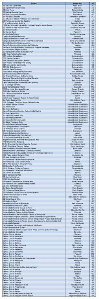 Observamos que 47 instituições não tiveram seus projetos publicados, mas constam da lista abaixo de participantes, em sua maioria por falta de adequação temática ou de resposta a outras orientações da Campanha. Como não incentivamos a competição, 86 instituições participarão do sorteio de 9 pluviômetros semiautomáticos e 9 kits de publicações, separados por categoria.